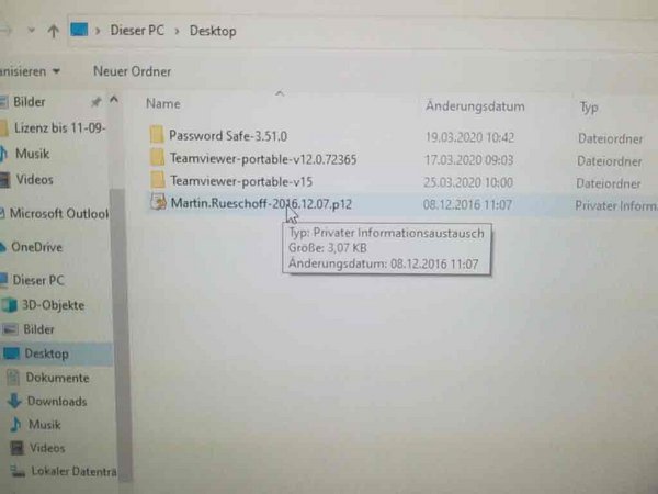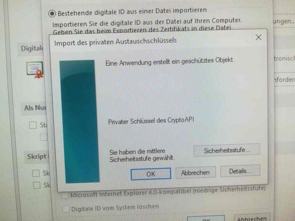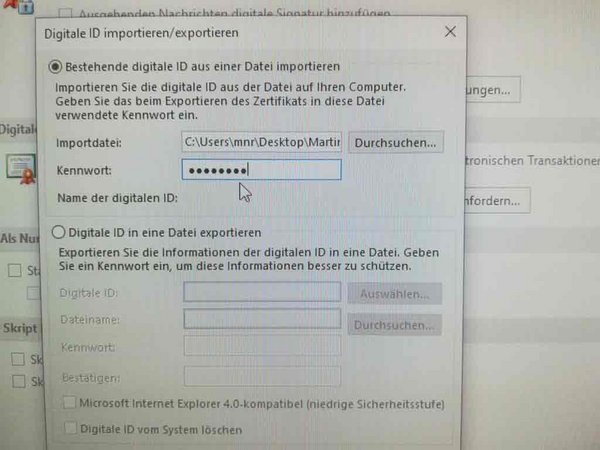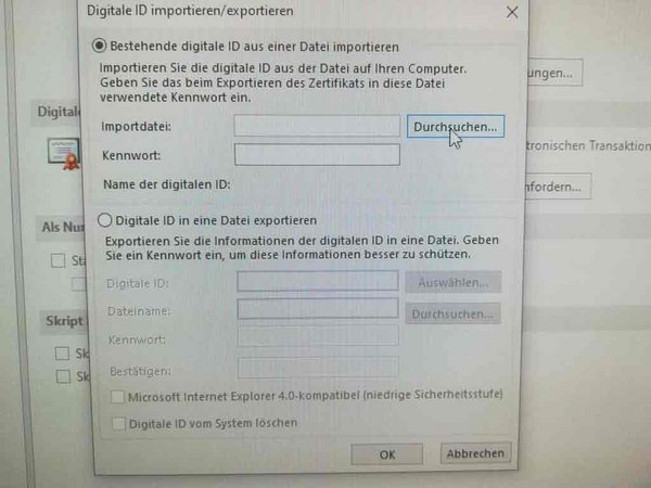 Es soll ein persönliches Zertifikat in Outlook importiert werden,